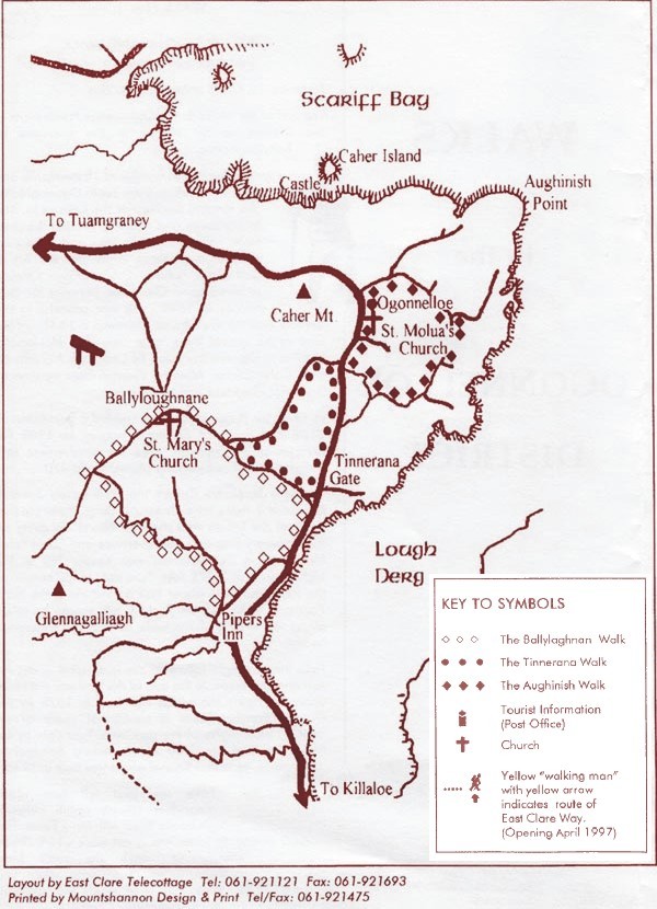 The East Clare Way Limited has developed a number of circular walks. These start and finish at towns and villages along the East Clare Way. Five walks are described that start in the centre of Scariff (R643845). Tuamgraney quay (R643834) is a good place at which to start two of the walks: