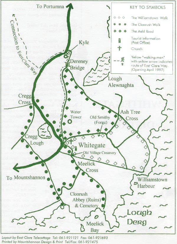 This page was developed from a pamphlet published by East Clare Way Limited. The material has been adapted slightly to focus more precisely on the needs of boating folks. The permission of East Clare Way Limited to publish extracts from the pamphlet is gratefully acknowledged. Particular thanks are due to Stasia Moroney for her assistance in the project to include East Clare walks in the IWAI Walks pages, Frank Reid for providing the original walk descriptions and advising on their adaptation to the Web, and to Gerry Burke for his helpful advice.