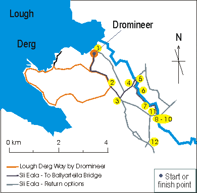 To return to Dromineer you have several options. You may decide to visit the Village of Ballycommon (R836823) or return by quiet roads. See map. An illustrated Guidebook to the Walk can be purchased in the local shops, price 50p.